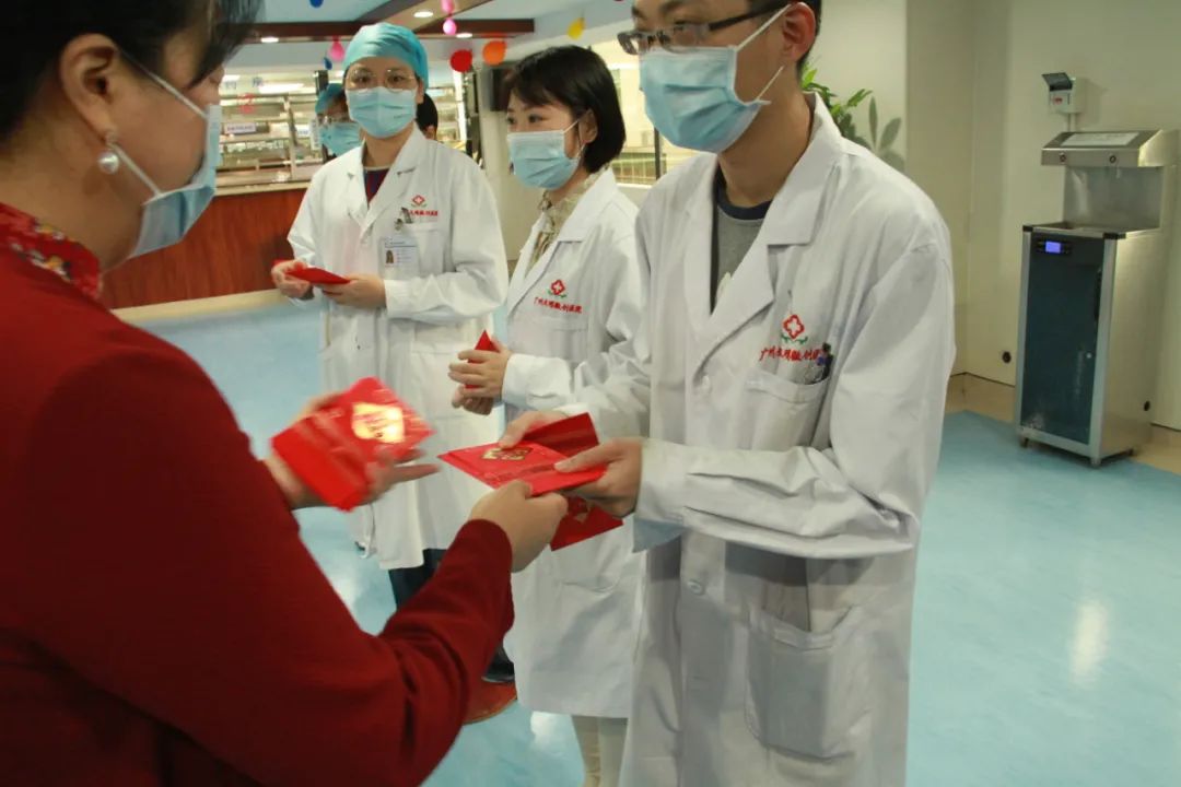 笑语辞旧岁,喜迎旺财年。2021年春节已经到来,为表达对每一位员工的关爱之情,在大年初七,医院所有科室及部门复工之日,刘文胜董事长携夫人叶爱娟及院内领导到各个科室、部门为员工发放开年红包。